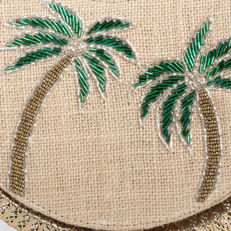 Experience the exquisite feel of nature with our fashionable circular jute bag, adorned with palm metallic embroidery. Crafted by skilled craftsmen in Bharat, this sturdy bag combines coziness and style. Perfect for any occasion. Explore the exclusive collection from Crystalicious now.